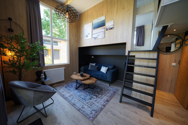 Het Tiny House Plus 4 heeft een speelse indeling en een leuke speelruimte. Het vrijstaand chalet is geschikt voor 4 personen. Op het gelijkvloers vind je een zithoek met televisie en een sfeervolle elektrische haard, een eethoek, een keuken met inductiekookplaat, koelkast, microgolfoven en koffiezetapparaat, én een badkamer. Met een ladder geraak je bij een slaapruimte met een tweepersoonsbed. Een andere ladder brengt je naar de slaapzolder met twee enkele bedden. Buiten het chalet heb je een privéveranda met tuinmeubels. Er is gratis wifi beschikbaar.