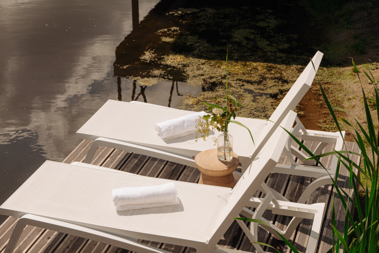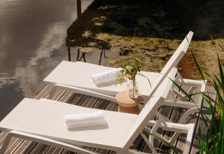 Vanaf het terras is er een trapje naar een in het water gelegen vlonder. Ideaal voor de afvaart van een kano of supboard. Maar ook een eigen steiger waar je lekker kunt lezen of borrelen. Al dan niet met de voetjes in het water. Wie doet je wat.