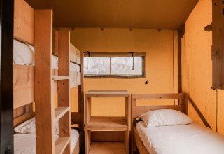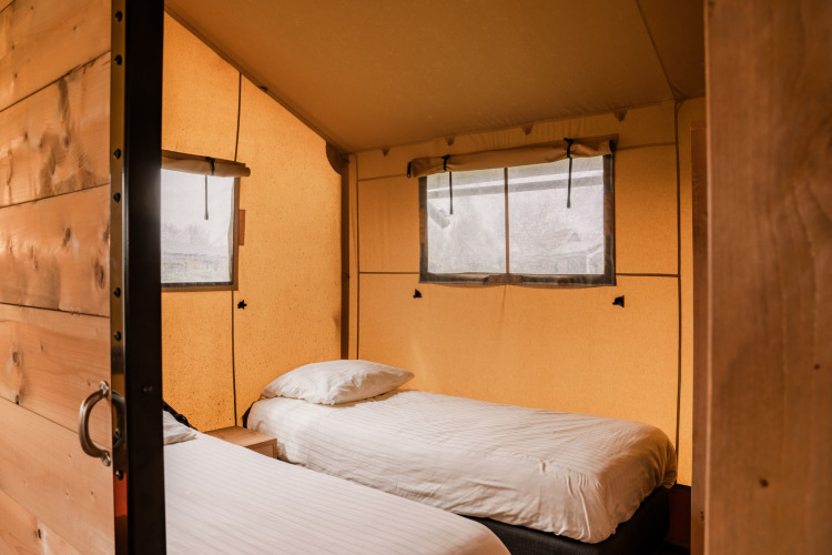 De 4 luxe vijfpersoons tenten hebben allemaal een eigen keuken, 2 slaapkamers en een complete badkamer. Eén van de slaapkamers heeft 2 boxspringbedden en de andere kamer heeft een stapelbed en een eenpersoonsbed.