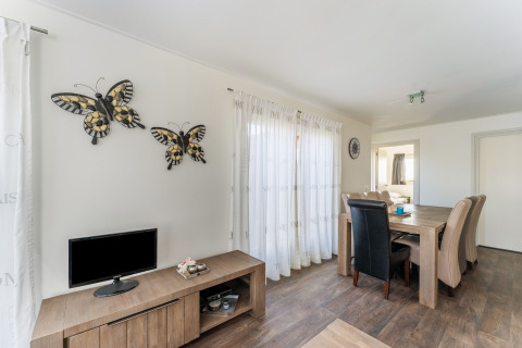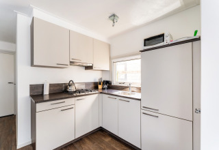 Binnen is het chalet ruim en licht, met een grote, gezellige leefruimte waar iedereen samen kan ontspannen. Plof na een dag op het water in de zetels, speel gezelschapsspelletjes aan de grote eettafel en geniet van lange diners die vlotjes overgaan in urenlange babbels. De eethoek biedt plaats aan 6 tot 8 personen, zo hoort niemand er niet bij.