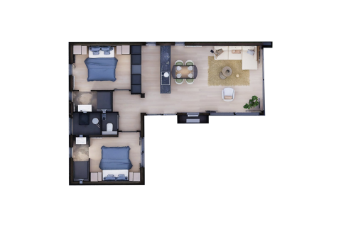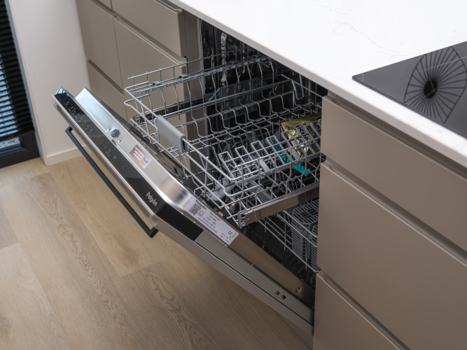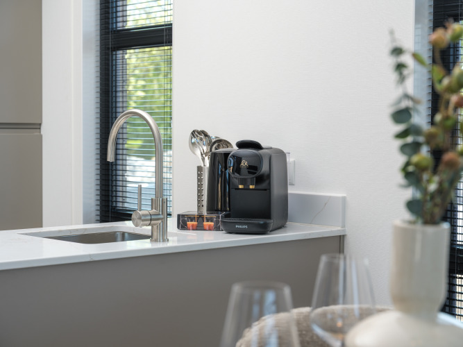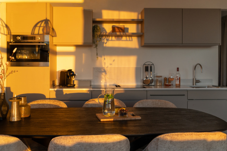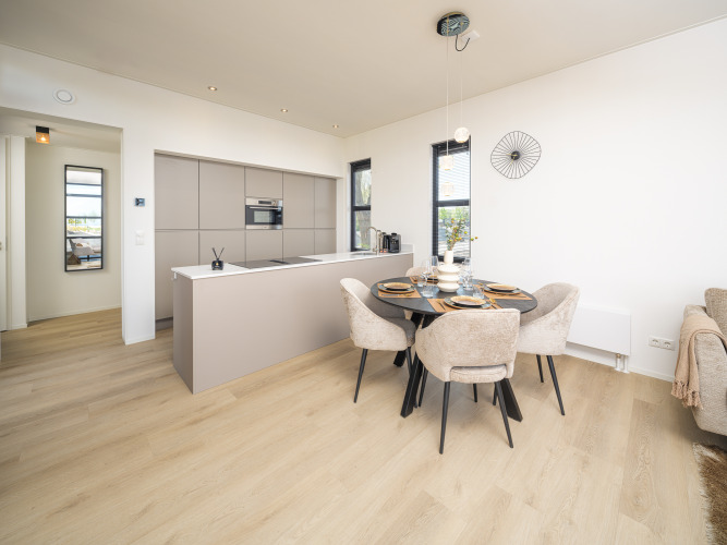 De woning is 70 m² groot en beschikt over een gezellige leefruimte met veel licht, een zithoek met TV, een royale eettafel en een moderne open keuken met kookeiland, combi-oven, vaatwasmachine en inductiekookplaat met ingebouwde dampkap.