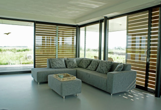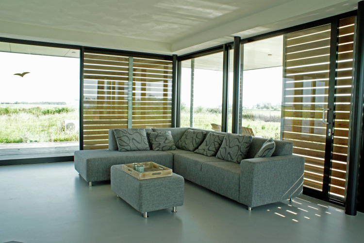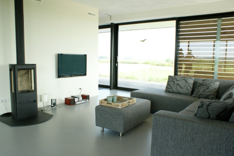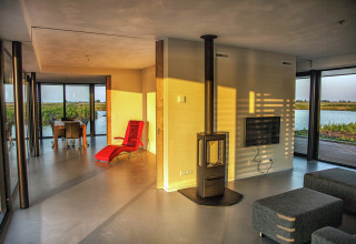 Binnen vind je een ruime leefruimte met grote ramen van vloer tot plafond. Waar je ook zit, je geniet van een panoramisch zicht over het water. Het licht stroomt rijkelijk binnen, en ’s avonds kan je gezellig wegkruipen bij de knusse gashaard, met een drankje en een goed gesprek.