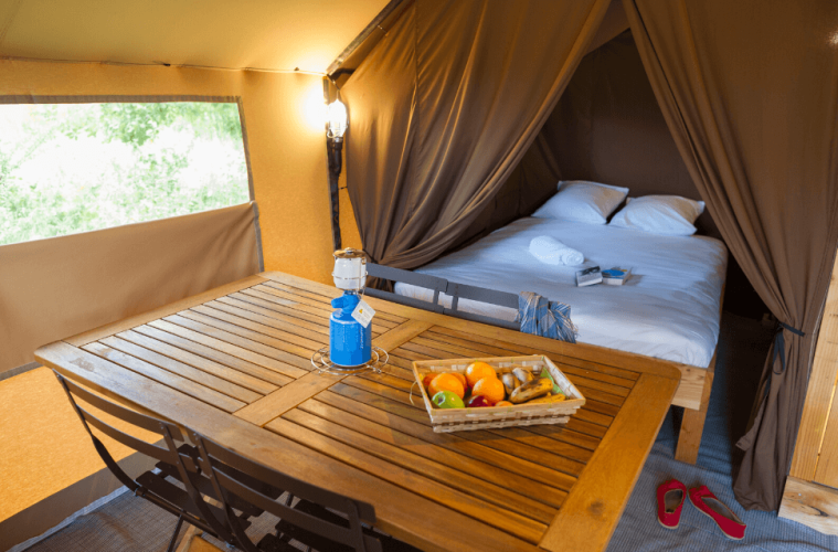 De gemeenschappelijke ruimte beschikt over een handige kitchenette met een tweepits gasfornuis, koelkast, opbergrekken, gootsteen en borden, plus een eetruimte met tafel en stoelen. Sommige modellen zijn zelfs uitgerust met een gezellige houtkachel voor extra warmte en sfeer.