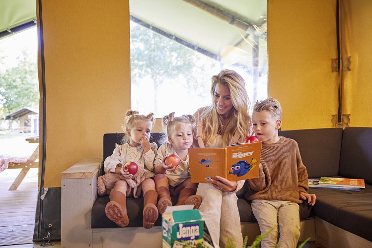 Kom tot rust in een 5-persoons Glamping Tent Luxe en ontdek hoe kamperen voelt met het comfort en de klasse van een hotel. Deze stijlvolle tenten liggen gezellig samen op een veldje met uitzicht op een groot speeltoestel – ideaal voor de kids en plezant voor iedereen. Alles vlakbij, want de centrale voorzieningen zijn om de hoek.