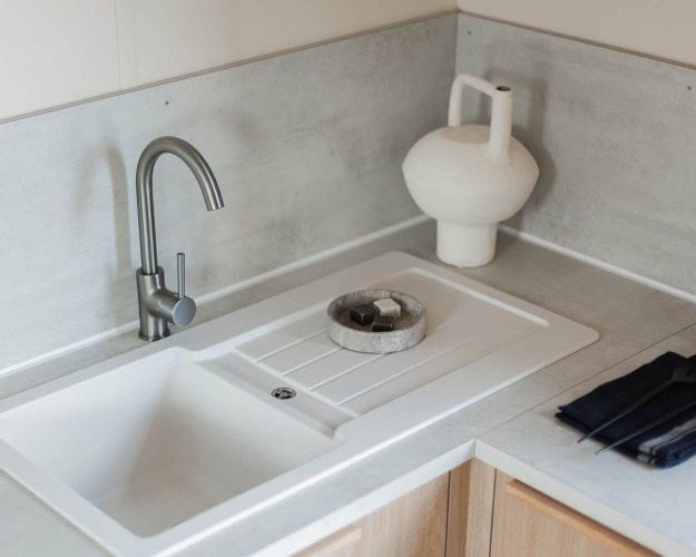 Ervaar de Sunset Lodge voor 4 personen en geniet van luxe met het comfort van thuis. Ontspan in de ruime zithoek met een avondje tv of schuif gezellig aan bij de keukentafel. Dankzij de centrale verwarming is het hier altijd knus, zowel zomer als herfst. De keuken is volledig uitgerust met koelkast, diepvriesvak, vaatwasser en Nespresso.