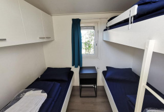 Dit chalet biedt plaats aan 5 personen en is volledig ingericht. Je beschikt over alle comfort voor een onbezorgde vakantie aan zee. Zo is de gezellige leefruimte voorzien van een tweepersoonszetel, twee comfortabele fauteuils, een eetruimte voor 5 personen en een flatscreentelevisie. Grote ramen en openslaande glazen deuren zorgen voor veel natuurlijk licht. In de aanpalende, volledig uitgeruste keuken kan je lekkere maaltijden klaarmaken. Die is voorzien van een gasfornuis, koelkast, diepvriezer, microgolfoven, koffiezet, en waterkoker. Daarnaast zijn er twee slaapkamers aanwezig (drie eenpersoonsbedden en een stapelbed), ideaal voor een flexibele groep of familie tot 5 personen. Een moderne badkamer met lavabo, douche en wc maakt de indeling van dit basic vakantiehuis helemaal af.
