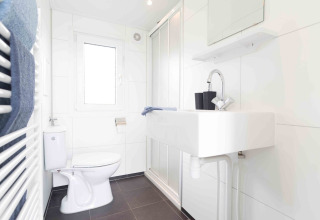 De indeling van dit comfortabele vakantiehuis wordt vervolledigd met een badkamer uitgerust met wastafel, douche en toilet. Vanuit de woonkamer leiden openslaande glazen deuren naar het mooi aangelegde terras met omringend gazon. Hier staat een eettafel voor 5 personen en een parasol. Het is de perfecte plek om te genieten van een goed boek, een hapje en een drankje of een heerlijke uitgebreide maaltijd op een zalige zomeravond.