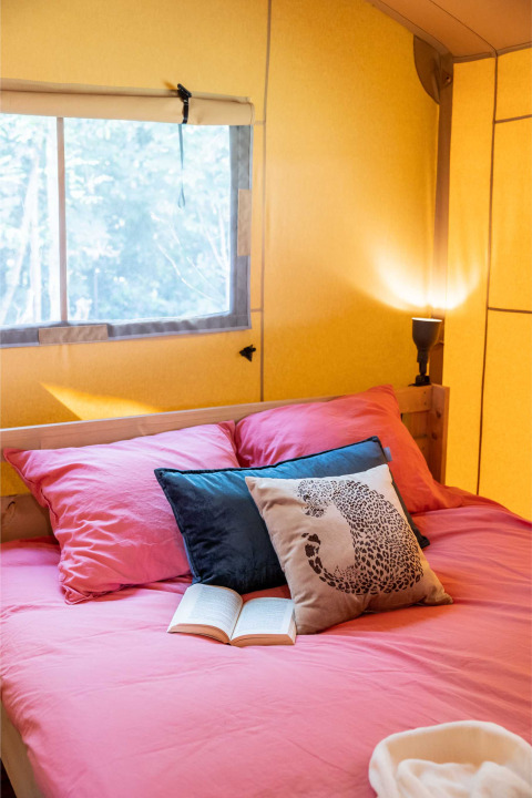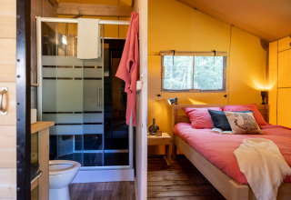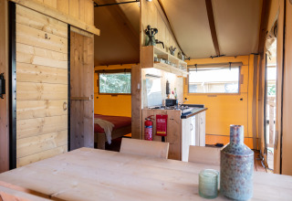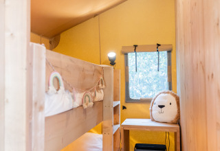 De indeling Deze ruime glamping tent voor 4 personen brengt het beste van twee werelden: de vrijheid en charme van kamperen gecombineerd met het comfort van een luxueuze verblijfplaats. Binnen vind je een gezellige leefruimte met een slaapkamer met tweepersoonsbed en een aparte kamer met een stapelbed – ideaal voor gezinnen of vrienden op uitstap.