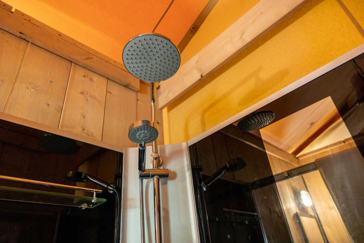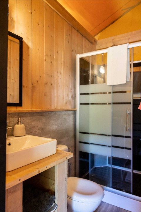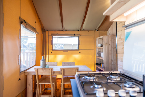 De tent is volledig uitgerust met een stijlvolle badkamer en een ruime, ingerichte keuken, zodat het je aan niks ontbreekt. Buiten nodigt de veranda uit om rustig de dag te starten bij de eerste zonnestralen, terwijl de kinderen spelen en de heide langzaam ontwaakt. Het gefluit van de vogels en de frisse buitenlucht maken het plaatje compleet.