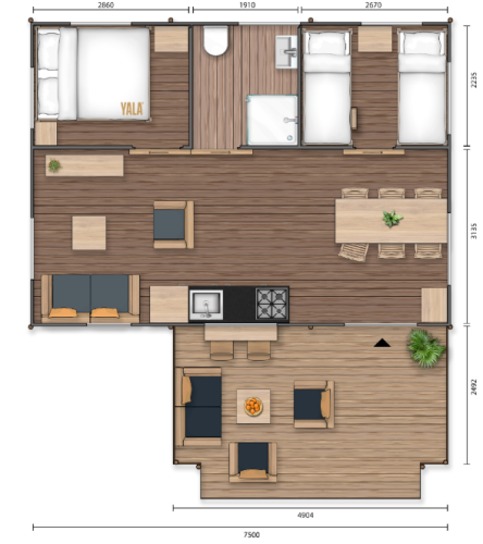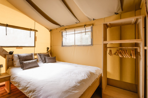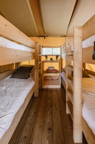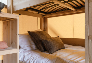 Binnen in de tent vind je een plek die aanvoelt als thuiskomen in de natuur. Er is een gezellige slaapkamer met een comfortabel tweepersoonsbed en een tweede kamer met twee stapelbedden – ideaal voor lange babbels voor het slapengaan en zalige, rustige ochtenden.