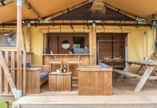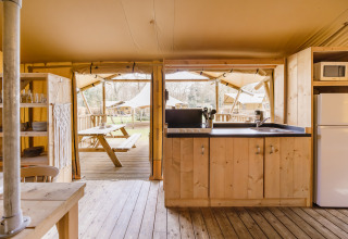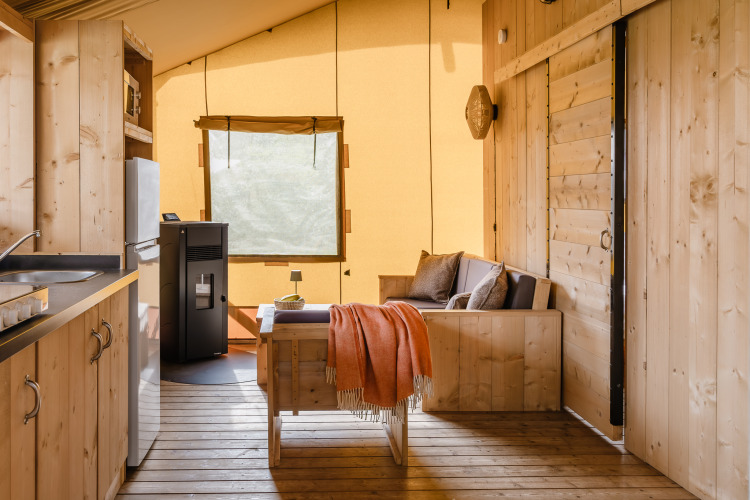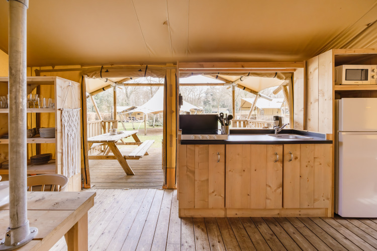 De tent is uitgerust met alles wat je nodig hebt voor een comfortabel verblijf. Binnen is er een volledig uitgeruste keuken, perfect voor lange avonden samen aan tafel. Aan de buitenbar ontstaat vanzelf dat ene vakantiegevoel: samen een glas inschenken, verhalen delen, lachen, en de dag traag zien overgaan in de avond. Geen haast, geen plannen – gewoon elkaar en de natuur om je heen. Als de avond valt en het wat frisser wordt, zorgt de pelletkachel voor gezelligheid en warmte. Het zachte vuur brengt rust, alsof je het kampvuur mee naar binnen neemt, en nodigt uit om nog wat langer te blijven zitten terwijl buiten de stilte valt. Daarnaast heeft de safaritent een infrarooddoek voor extra comfort.