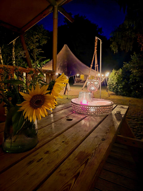 De tent is voorzien van alles wat je nodig hebt voor een aangenaam verblijf. Je vindt er een ruime keuken met vaatwasser, perfect voor lange avonden samen rond de tafel. Buiten kan je volop genieten van het buitenleven. In de privé hottub kom je volledig tot rust, omgeven door de natuur. Als de avond valt en het wat frisser wordt buiten, zorgt de pelletkachel voor een gezellige warmte en sfeer. Het zachte vuur brengt rust, alsof je een kampvuurtje in huis hebt gehaald, en nodigt uit om nog wat langer samen te zitten terwijl de stilte rondom neerdaalt.