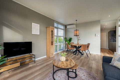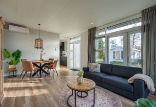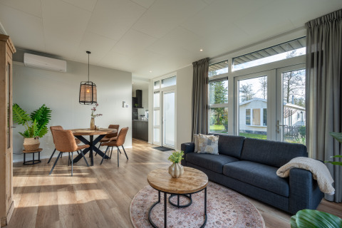 Ontspan in een comfortabele Boslodge voor 4 personen, rustig gesitueerd aan de rand van het park. Geniet van de lichtrijke leefruimte met gezellige zithoek, flatscreen tv en open keuken, volledig uitgerust met een 4-pits kookplaat, combimagnetron, vaatwasmachine, Nespresso en frigo met vriesvak. Slapen doe je in twee slaapkamers met boxspringbedden of twee aparte eenpersoonsbedden. De badkamer is voorzien van een douche, wastafel en toilet. Via de grote glazen schuifdeuren kom je meteen op het zonnige terras, met loungeset en privé-hottub — ideaal voor lange avonden in de buitenlucht. Je geniet van airco, wifi, rookvrije en huisdiervrije ruimtes en een was-droogcombinatie.