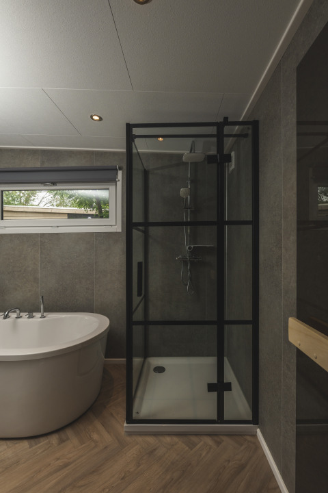 - Een ligbad, sauna én regendouche