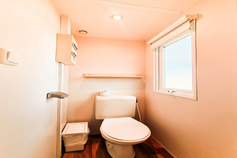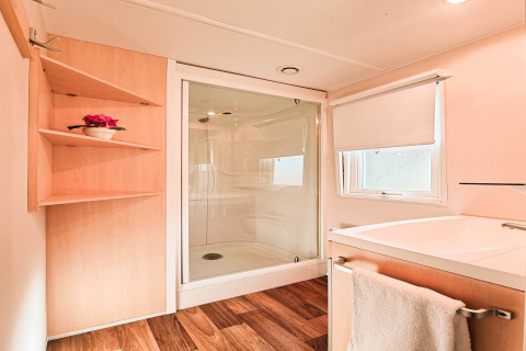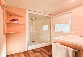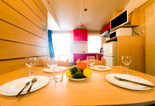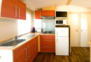 De open, elektrische keuken is volledig uitgerust voor een zorgeloos verblijf met eigen kookgelegenheid. Je vindt er een koelkast, diepvries, microgolfoven, koffiemachine, broodrooster, en al het nodige servies en bestek. Of je nu snel iets klaarmaakt om op stap te gaan, of een eenvoudig avondmaal wilt koken om op het terras te eten – alles is aanwezig.