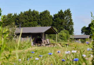 Het tenthuisje biedt alles wat je nodig hebt voor een ontspannen verblijf. Binnen vind je een ruime leefruimte met een gezellige bank en een grote eettafel waar je met het hele gezin of vrienden samenkomt. Twijfel je tussen binnen of buiten? Op de veranda zit je heerlijk beschut onder de luifel, met een picknicktafel en loungestoelen om lekker te relaxen. Buiten geniet je van een hottub!