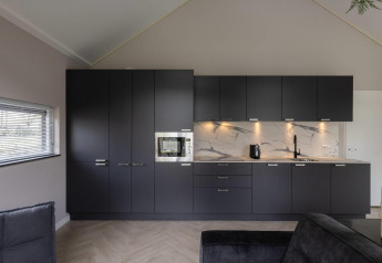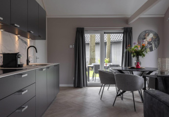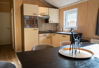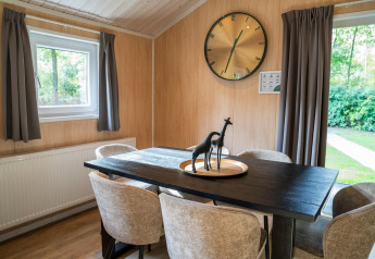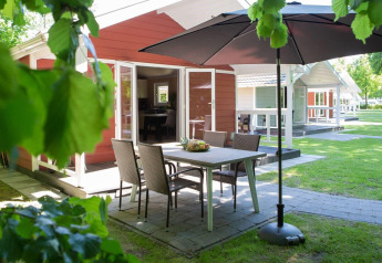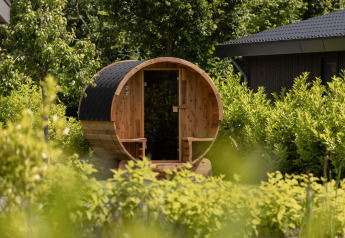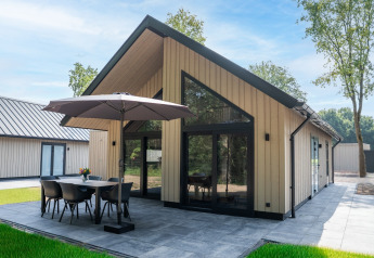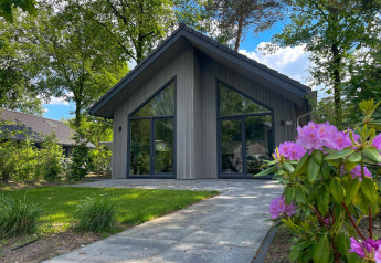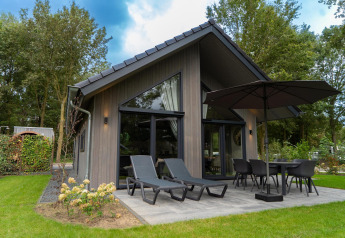 Buitenruimte aan een tiny house met houten gevel, sauna en hottub bij Holiday Park Mölke, Nederland.