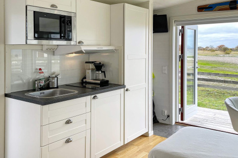 Het huisje is compact, maar slim ingedeeld en goed onderhouden – perfect voor maximaal drie gasten. Je slaapt in een kleiner tweepersoonsbed (1,40 m) en een comfortabel eenpersoonsbed. De praktische kitchenette is uitgerust met twee kookplaten, een microgolfoven, een waterkoker, een koffiemachine en een koelkast met vriesvak – alles wat je nodig hebt voor eenvoudige vakantie-maaltijden. Er is ook een kleine badkamer met douche en, als extraatje, een privé-sauna.