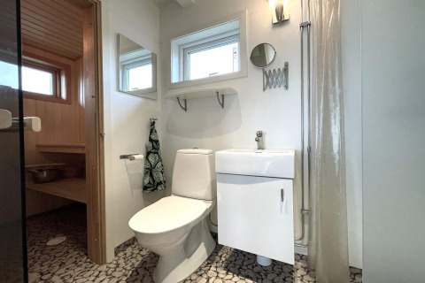 Zelfs vanuit de sauna geniet je dankzij een raam van het uitzicht op zee en de haven van Sandvik – een unieke plek om helemaal tot rust te komen na een dag in de buitenlucht. Buiten is er een ruim terras gericht naar het water, compleet met tuinmeubilair en een barbecue. Dé plek om 's avonds lang te tafelen en de zon in de zee te zien zakken.