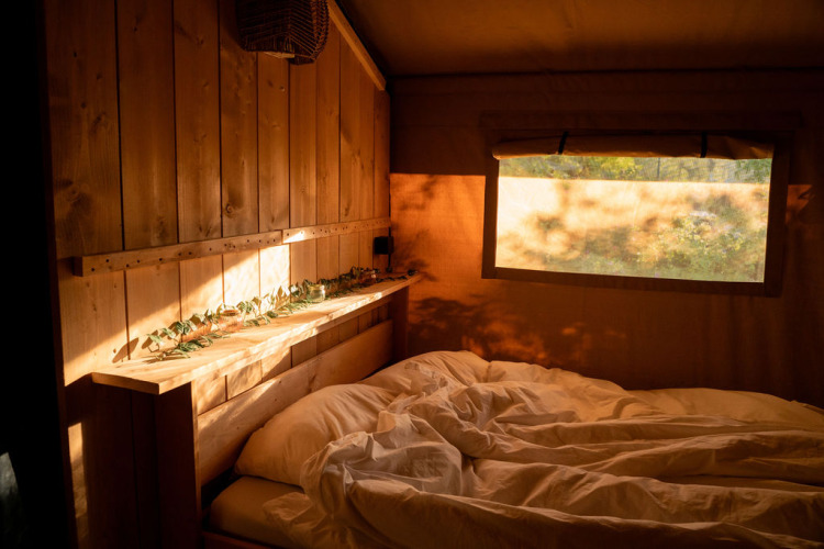 De safaritent met sanitair is een luxe safaritent geschikt voor maximaal 4 personen, een ideale accommodatie voor een vakantie met het gezin of een groep! Met een oppervlakte van 25m2. Eet met z’n allen aan de grote tafel met stoelen, gooi de voorkant van de tent helemaal open en geniet extra van het uitzicht en de frisse lucht. Maak maaltijden klaar in de complete keuken en kom aan het einde van de dag tot rust op een van de luxe stoelen of in een van de 2 slaapkamers. In de ene slaapkamer vind je een groot tweepersoonsbed, en in de andere kamer staat 1 stapelbed. Met een lengte van 2 meter zijn de bedden geschikt voor zowel kinderen als volwassenen. Om je glamping vakantie nog extra luxe te maken is de safaritent uitgerust met een volledige badkamer met een douche, toilet en wasbak.