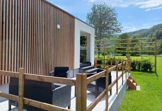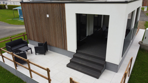 Deze Eco Lodge Moblina combineert comfort en natuur in perfecte harmonie. De centrale woonruimte vormt het hart van de lodge, met een gezellige zithoek, een eettafel en een keuken die aan alles gedacht heeft: van een elektrische kookplaat tot vaatwasser, koelkast met vriezer, magnetron en zelfs een voorraad pannen, glazen, borden en bestek.