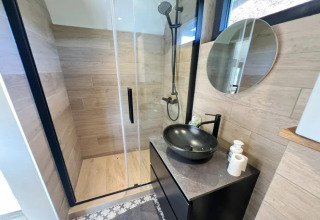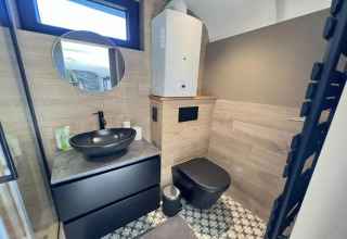 Binnen vind je een slimme, comfortabele indeling met alles wat je nodig hebt en niets wat je niet nodig hebt. De slaapkamer is gezellig en uitnodigend, met een comfortabel bed waarin je lekker kunt uitslapen, een boek lezen, of gewoon kunt luisteren naar de stilte buiten. Het huisje heeft een eigen badkamer, zodat je tijdens je ontspannen uitje alle comfort en privacy hebt die je verwacht.