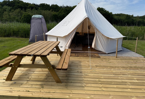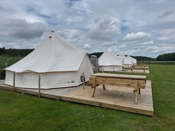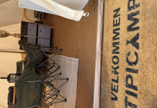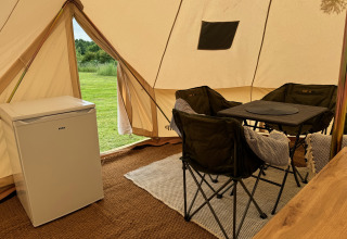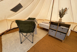 Deze knusse Tipi Tent is geschikt voor 4 personen en beschikt over een houten vloer en een overdekt terras met tafel en stoelen. Binnen vind je comfortabele bedden met dekbedden en kussens, en alles wat je nodig hebt om zelf te koken: een koelkast, servies, bestek, pannen en kookgerei. Buiten staat een Weber houtskoolbarbecue klaar voor gebruik. Een eenvoudige maar complete uitvalsbasis voor een ontspannen verblijf in de natuur.