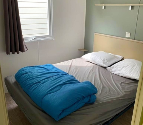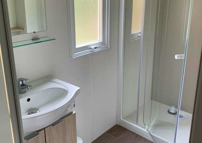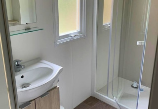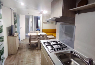 Deze mobilhome van 30 m² heeft een praktische indeling met een gezellige woonruimte en televisie. In de woonkamer staat een slaapbank die gebruikt kan worden als extra slaapplaats. De keuken is uitgerust met kookpitten, een magnetron, Senseo-apparaat, koelkast met vriesvak en een vaatwasser. Dankzij de omkeerbare airconditioning en verwarming blijft het binnen het hele jaar door aangenaam. Dekbedden en kussens zijn aanwezig en lakens kunnen optioneel worden bijgeboekt. De badkamer beschikt over een douche en er is een apart toilet aanwezig.