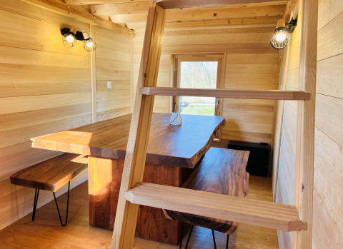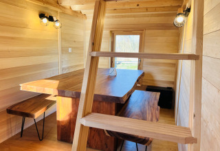 Op de begane grond vind je een tweepersoonsbed, een badkamer met inloopdouche en toilet, en een gezellige zithoek met bank en tafel. Via een ladder bereik je de vide, waar nog een tweepersoonsbed staat. De hut is uitgerust met een kleine koelkast, een koffiezetapparaat, een waterkoker en een wijnkast met een selectie lokale dranken om te proeven.