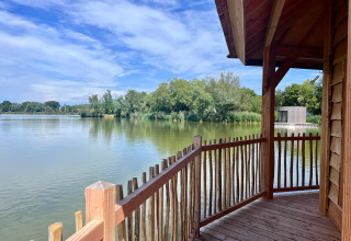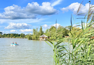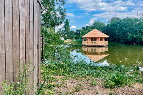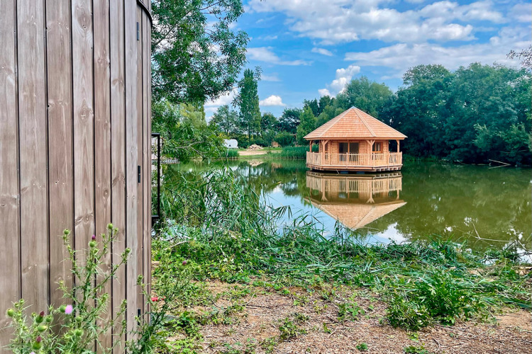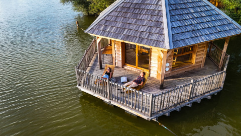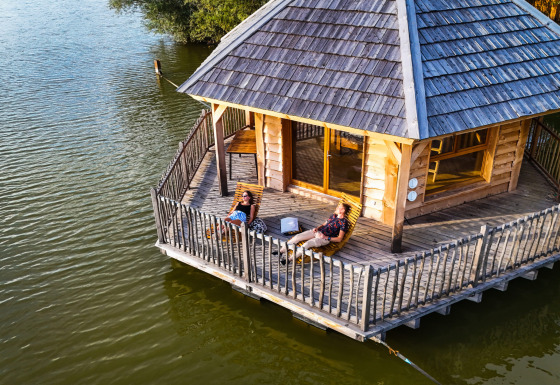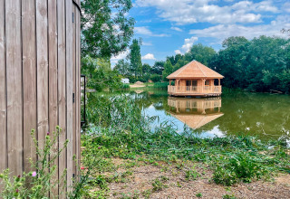 Je bereikt de hut via een drijvende loopbrug en de badkamer grenst aan een drijvend terras. Daarnaast heb je een bootje tot je beschikking om vrij over de vijver te varen, ideaal om naar de gezamenlijke wellnessruimte aan de overkant van de oever te gaan (inbegrepen bij je verblijf).