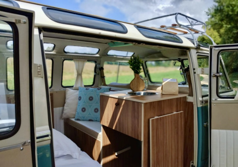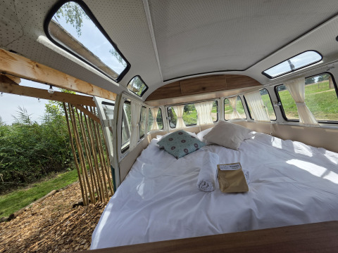 Voor twee personen: ontsnap voor één nacht in een echte Volkswagen camper. Deze staat op een prachtige plek aan het water, verscholen in een rustig hoekje van het Domaine, ver weg van nieuwsgierige blikken. Voor liefhebbers van oldtimers en voor iedereen met een vleugje nostalgie naar de jaren ’60 en ’70 is dit dé kans om een onvergetelijke, bohemien overnachting te beleven met een adembenemend uitzicht op het meer.