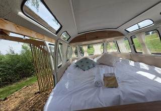 De camper is voorzien van een bed van 140 x 190 cm en er is beddengoed en handdoeken aanwezig. Onder de overdekte veranda staat tuinmeubilair waar je kunt genieten van het inbegrepen en bezorgde ontbijt, of van een optioneel diner, borrel of picknickmand. Er zijn ook ligstoelen om heerlijk te ontspannen en volop te genieten van de bijzondere omgeving.