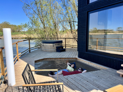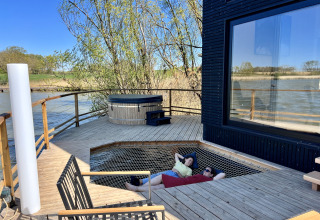 De meest gezellige plek om met het hele gezin samen te komen is het buitenterras. Hier vind je een comfortabele loungeset, een hangnet direct boven het water en een privéjacuzzi. Er staat een bootje klaar om over de vijver te varen of om naar het lagoonzwembad, de receptie of de bar aan de overkant van de oever te gaan.