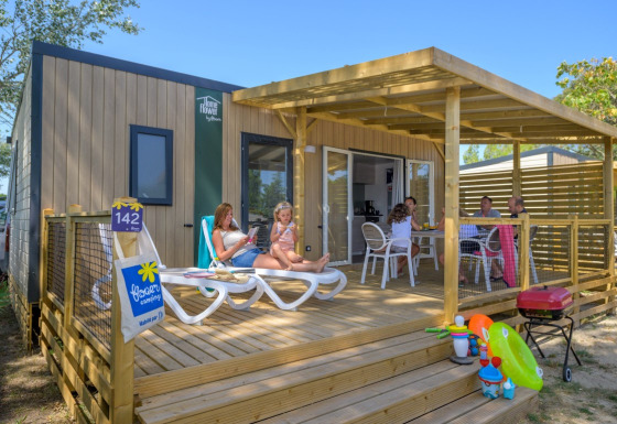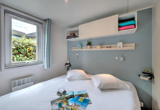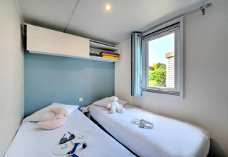 Ontdek deze ultramoderne stacaravan van 35 m², ideaal voor 6 personen. Uitgerust met omkeerbare airconditioning, zorgt hij voor optimaal comfort. De drie slaapkamers zijn voorzien van verduisteringsgordijnen voor een goede nachtrust (een met een tweepersoonsbed van 160x200 cm en vier eenpersoonsbedden van 80x190 cm).