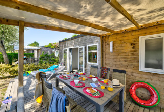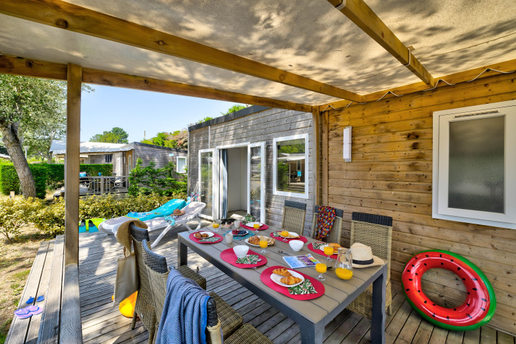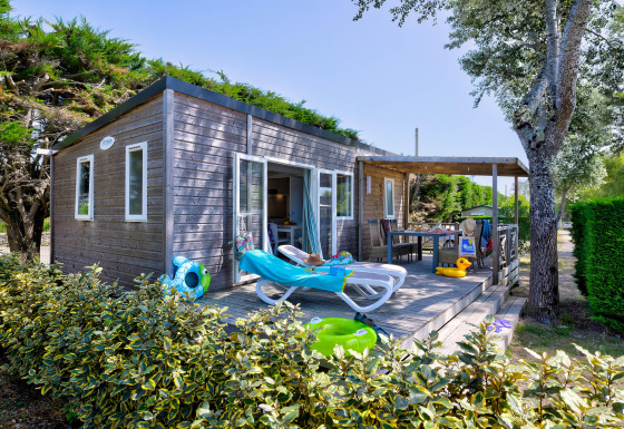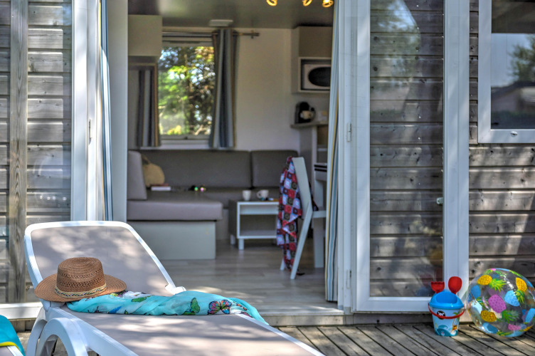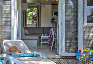 Geniet van een rustig verblijf in de natuur met deze Premium Houten Mobilhome, een ruime en comfortabele accommodatie met een mooi terras om van het buitenleven te genieten. Dit mobilhome van 30m² is ontworpen om je een ontspannende uitvalsbasis te bieden in Bretagne, vlakbij de stranden en de wilde natuur van Quiberon.