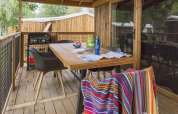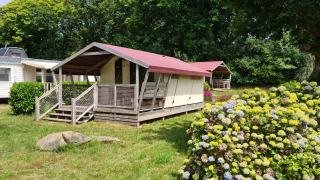 Grande tente en semi dur avec kitchenette bien équipée. Le ménage avait été fait succinctement : insectes, toile d'araignées. Pas de sanitaires proches de la tente car en travaux et espace lavabos et pour faire la lessive toujours sale. En ce qui concerne les seules douches au fond du camping : propres, mais seulement 2 jours d eau chaude sur 5 nuits de location. Le tout pour plus de 250 euros tout compris ;( .... et en promo !!!! Ils nous ont fait cadeaux des 20 euros demandés pour le chien .... trop sympa !!!! Seul point positif l accueil des deux jeunes gens du bureau. Merci à eux pour leur gentillesse.