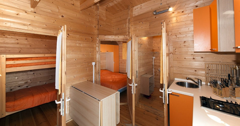 Binnen vind je een gezellige leefruimte met eethoek en een volledig uitgeruste keuken, inclusief magnetron en Senseo-koffiezetapparaat. Het chalet beschikt over een slaapkamer met een tweepersoonsbed (140 cm) en kastruimte, evenals een aparte kamer met stapelbedden, ideaal voor kinderen of tieners. De badkamer is voorzien van alle sanitaire gemakken.