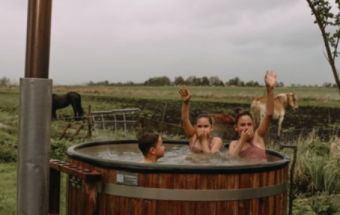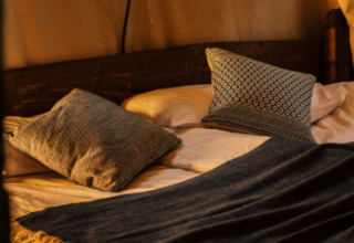 Onder een elegante overkapping ontstaat een plek waar buitenleven en comfort moeiteloos samenkomen. Bijna 50 m² leefruimte biedt een gezellige zithoek, volledig uitgeruste keuken met houtkachel en een eettafel voor zes. De zijkanten rollen eenvoudig open voor een verfrissende zomerbries, terwijl knusse hoekjes uitnodigen om tot rust te komen. Met drie slaapkamers, een bedstee en stapelbedden is er ruimte voor het hele gezin. De privé buitendouche met warm water, het echte spoeltoilet en de houtgestookte hottub maken het verblijf extra bijzonder. Of de zon schijnt of een zachte regen neerdaalt, dankzij de natuurlijke temperatuurregulatie en het overdekte terras voelt elke dag hier zorgeloos en aangenaam.