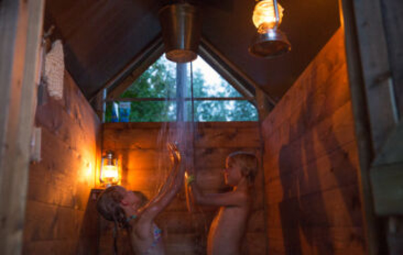 Faciliteiten en activiteiten bij Overkapt Tenthuisje met warme privédouche naast de tent met Hottub
