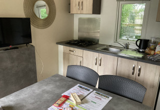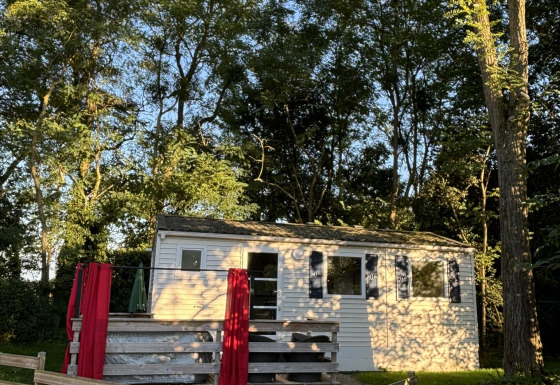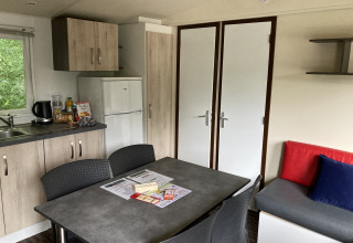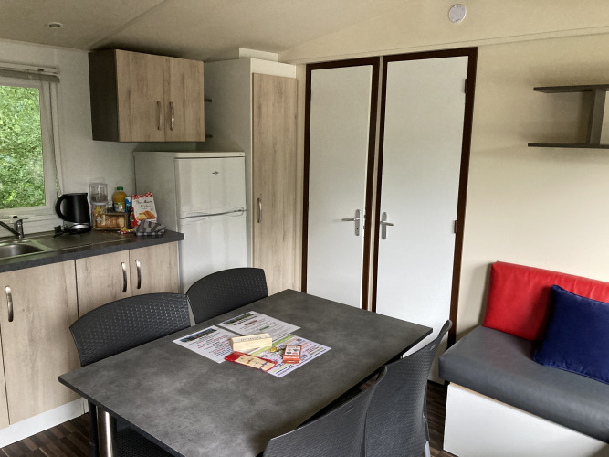 Er zijn twee slaapkamers, een met een tweepersoonsbed (140x190cm) en een met twee eenpersoonsbedden (90x190cm), en tuinmeubilair op het terras. Er zijn gemeenschappelijke barbecues (zelf houtskool meenemen!) op de camping. Verwarming en airconditioning d.m.v. een warmtepomp.