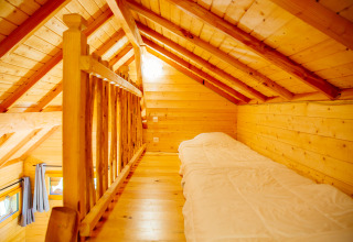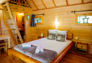 Verstopt tussen de dennenbomen staat deze bijzondere boomhut, geïnspireerd op de traditionele jachthutten uit het zuidwesten van Frankrijk. Hier verblijf je letterlijk tussen de vogels, op een verhoogd terras waar je geniet van rust, natuur en uitzicht. De hut biedt plaats aan 5 personen en beschikt over twee slaapkamers: een knusse kamer met een tweepersoonsbed (160x200) en een vide met drie losse bedden (90x190).