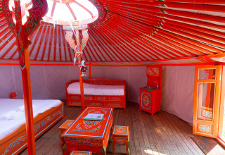 Binnen vind je één ruime, gezellige leefruimte met een tweepersoonsbed en twee eenpersoonsbedden waaronder bij beide een tweede bed uit geschoven kan worden. Zo is de Yurt geschikt voor zes personen - ideaal voor een gezin of vriendengroep.