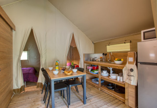 Deze gemeubileerde lodge van 34,5 m² biedt alle comfort voor een aangenaam verblijf en beschikt over een overdekt terras van 11,5 m². De lodge heeft twee slaapkamers: één met een tweepersoonsbed van 160 cm en één met twee eenpersoonsbedden van 80 cm. De keuken is volledig ingericht en de badkamer is voorzien van een douche en toilet. Kussens en dekens zijn inbegrepen.