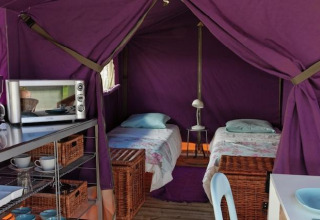 Overnacht dicht bij de natuur in een knusse bungalow die perfect is voor een gezinsvakantie met vijf personen. Ontspan in de eenvoudige, maar functionele ruimte met twee aparte slaapkamers: één met een tweepersoonsbed en één met een slaapbank en een eenpersoonsbed. Bereid maaltijden in de praktische keukenhoek en geniet samen van het eten op het overdekte terras met tuinmeubilair. De bungalow beschikt niet over eigen sanitair of warm water, maar biedt wél een ontspannen, no-nonsense sfeer midden in het groen. Ideaal voor wie houdt van buiten leven met basiscomfort. In juli en augustus is aankomst mogelijk op woensdag of zaterdag, met een minimale verblijfsduur van zeven nachten. Perfect voor een ongedwongen glampingvakantie.