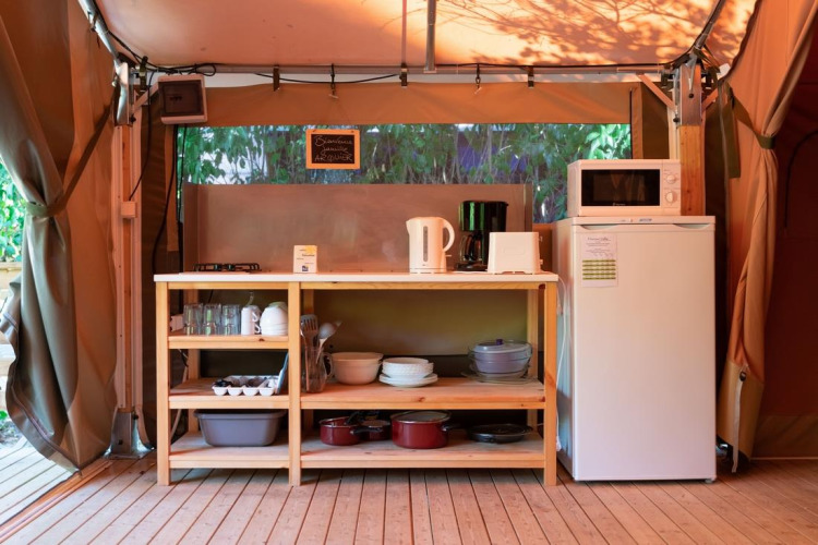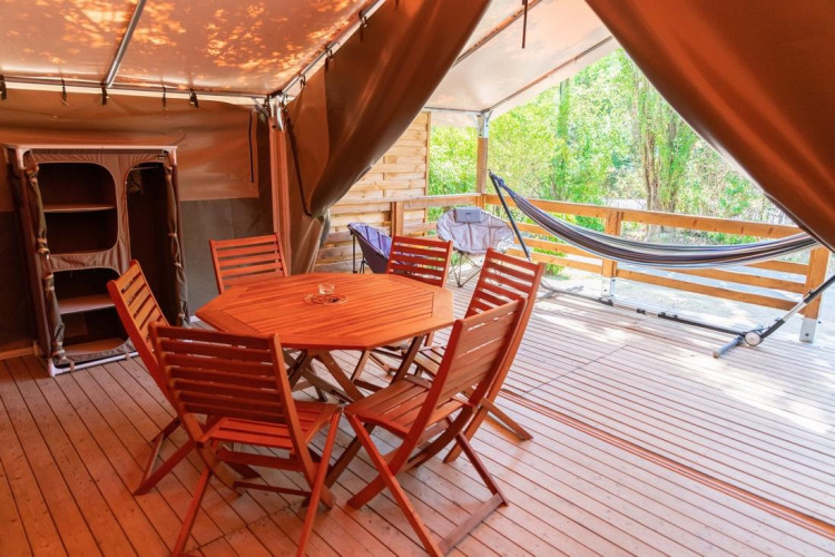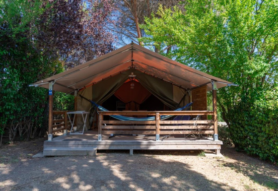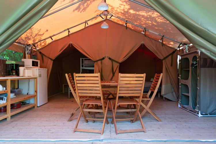 Deze grote, volledig uitgeruste tent van 40 m², inclusief terras, biedt een comfortabele en sfeervolle verblijfservaring midden in de natuur. De accommodatie beschikt niet over eigen sanitair of een wateraansluiting, maar de gemeenschappelijke sanitaire voorzieningen bevinden zich op korte afstand.