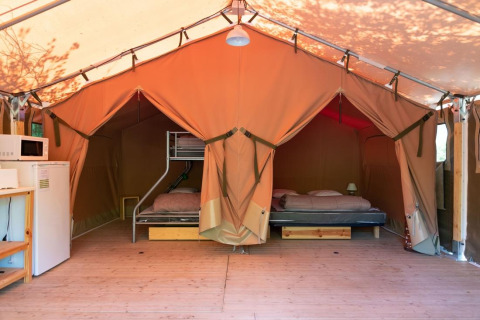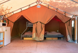 Honden zijn toegestaan (optioneel), zodat ook je trouwe viervoeter mee kan op vakantie. In de tent zijn twee slaapkamers aanwezig: één met een bed van 140 cm en één met een bed van 160 cm. Daarnaast is er op de mezzanine een extra bed van 80 cm. Dekbedden en kussens zijn aanwezig; linnengoed kan optioneel worden bijgeboekt.