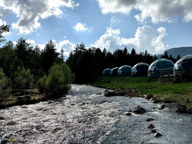 Overnacht in een stijlvolle Eco-Lux Dome, waar comfort en eenvoud samenkomen. Ontspan in een warme sauna, schuif aan voor zomerse diners in een glazen huis, en proef verse, biologische maaltijden aan een lange, gezellige tafel. Stap direct vanuit je dome de natuur in: naar stille bergen, kristalheldere meren en het ruige, ongerepte Setesdal.