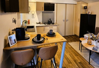 Neptunes mobile home biedt het ideale kader voor een ontspannen en comfortabel verblijf midden in de natuur. In de slaapkamer vind je een comfortabel tweepersoonsbed, terwijl de zithoek en eethoek in de woonkamer indien nodig kunnen worden omgebouwd tot een extra slaapbank. De keuken is volledig uitgerust en beschikt over een grote koelkast met vriesvak, een gaskookplaat, afzuigkap, kookgerei, bestek en servies. Voor een perfect begin van de dag zorgt een Nespresso-koffiemachine. Er is een badkamer met douche en daarnaast een apart toilet.