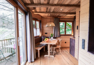 De luxe boomhutten Weitblick en Zeitraum bieden circa 32 m² comfortabele ruimte voor maximaal 4 personen. Het interieur is volledig ingericht met lokaal hout en met meubels van gerecycled hout en lichte lambrisering, wat zorgt voor een warme, natuurlijke sfeer. De boomhut heeft twee aparte slaapkamers met tweepersoonsbedden, één op de begane grond en één op de eerste verdieping. De woonruimte omvat een gezellige eethoek en een kitchenette met een koelkast en vaatwasser. De badkamer is voorzien van een douche en toilet. Een grote veranda en een dakterras bieden ontspannende uren hoog boven de grond, begeleid door het getjilp van krekels en vogelzang. Er is parkeergelegenheid op ongeveer 70 meter afstand, zodat u geen last heeft van verkeerslawaai. De boomhutten worden van stroom voorzien door milieuvriendelijke, zelf opgewekte zonne-energie. Op verzoek kan een ontbijt met regionale producten in een picknickmand direct bij uw accommodatie worden bezorgd.