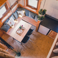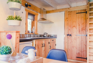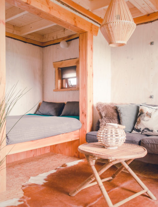 De houten boomhut ziet er van binnen net zo houten uit als vanaf buiten, maar dan gezelliger. De gehele ruimte is mooi ingericht en je hebt er eigenlijk alles wat je nodig hebt: een bank, een (eef)tafel een keukentje (inclusief keukengerei), een badkamer en natuurlijk een fijn bed. Het bed is geplaatst in een ouderwetse bedstee die het bed erg knus en speciaal maakt. Daarnaast is er ook een verwarming in de boomhut, waardoor je in de wintertijd er ook goed kan verblijven. Op de eettafel worden we nogmaals vriendelijk begroet met een vrolijke ballon, twee flesjes prosecco en een (ook houten) kaartje waarin Mölke ons welkom heet. Bijna alles in de glamping is van hout gemaakt wat, samen met het kraken van de muren, zorgt voor een echte boomhut sfeer.